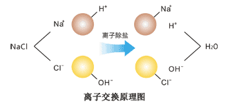 當原水通過離子交換柱時,水中的陽離子和水中的陰離子(HCO-等離子)與交換柱中的陽樹脂的H+離子和陰樹脂的OH-離子進行交換,從而達到脫鹽的目的。陽、陰混柱的不同組合可使水質達到更高的要求。